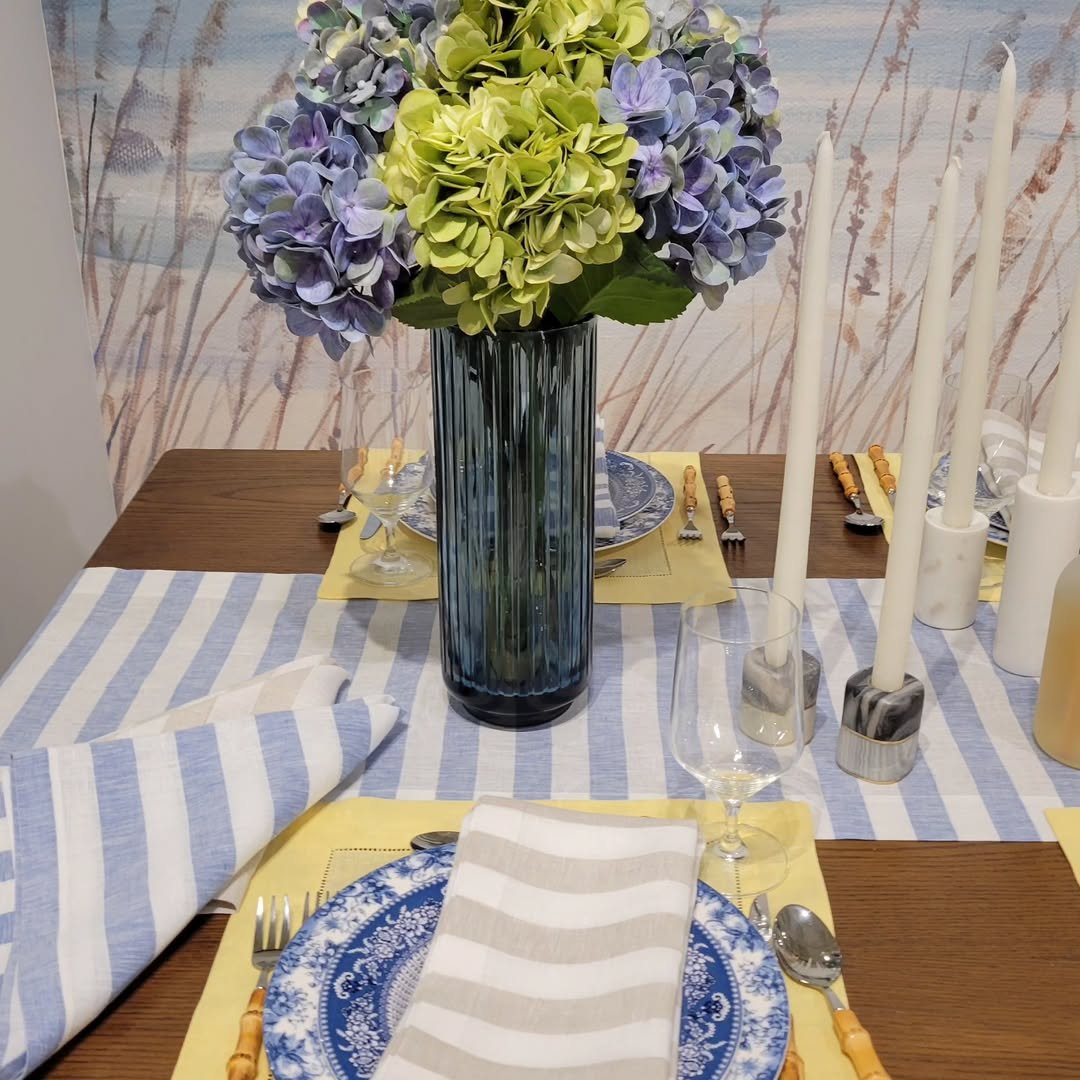 There’s something about blue and white stripes that instantly feels like summer by the water. Paired with hydrangeas and simple glassware, this table feels fresh, unfussy, and ready for a long lunch.