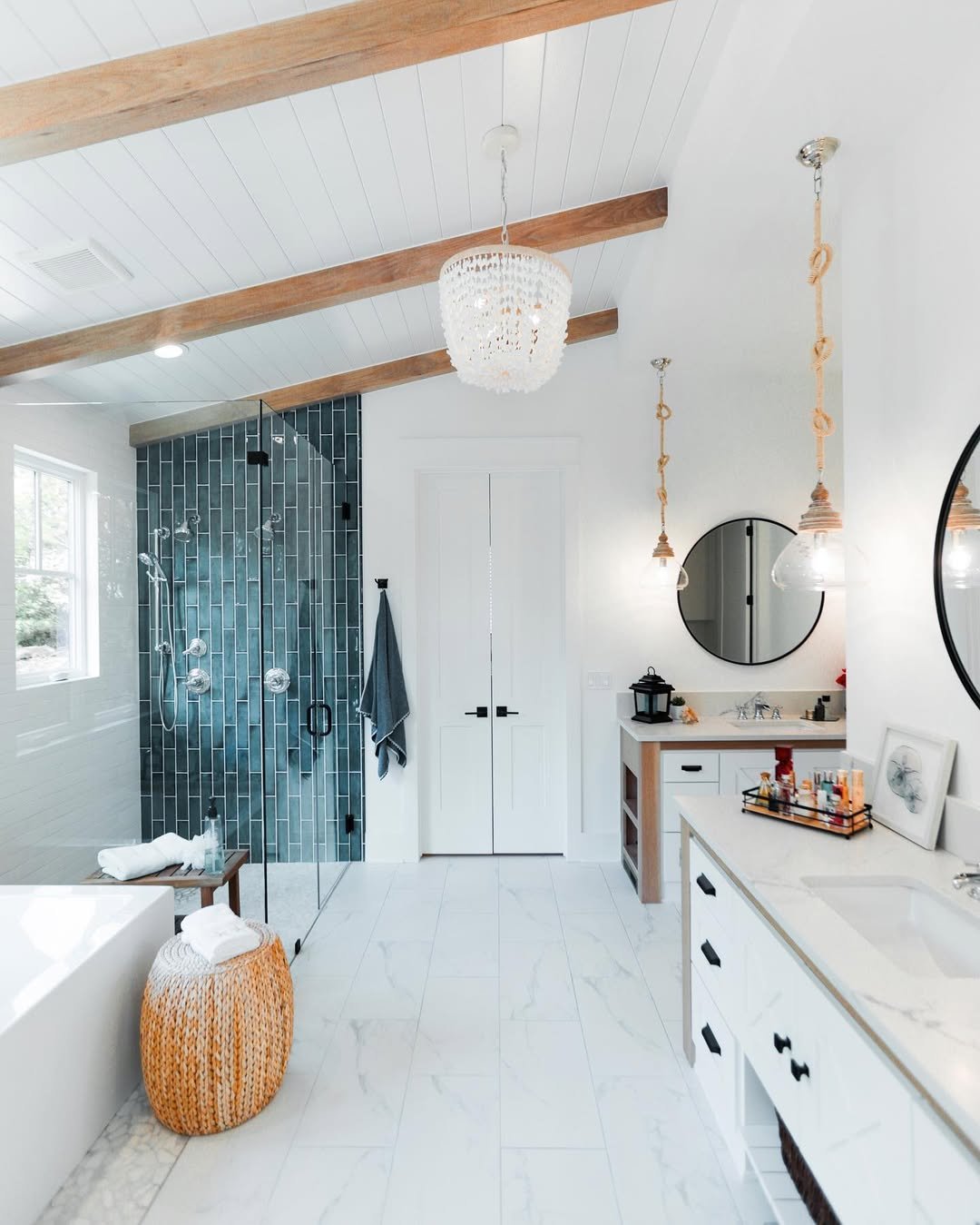 This bathroom leans into that clean, coastal calm that feels instantly restorative. Crisp white surfaces, soft wood beams, and that deep sea-toned tile wall create a space that feels fresh but grounded.
