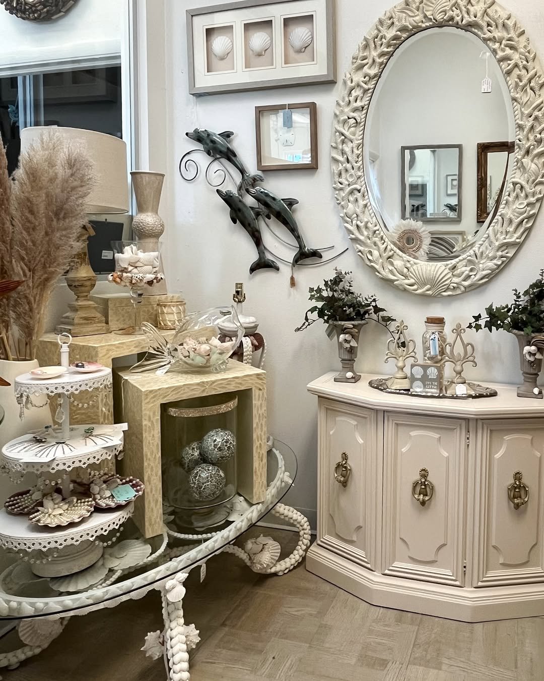 This space leans into ornate details with a coastal twist. Carved frames, shell accents, and soft ivory tones create a look that feels romantic and slightly nostalgic.