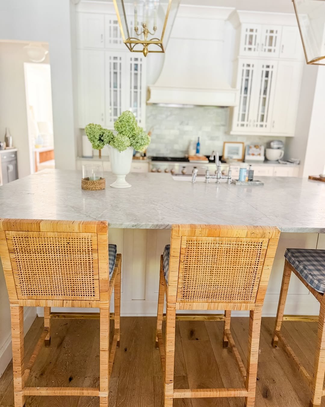 There’s a softness here that comes from the mix of textures. Woven bar stools, marble countertops, and creamy cabinetry create a kitchen that feels both refined and welcoming.