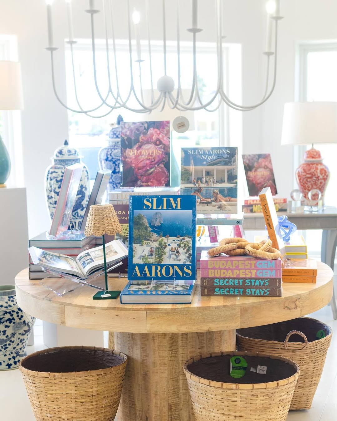 This tabletop feels like a snapshot of seaside living. Stacked books, woven baskets, and layered ceramics create a look that’s casual but curated.