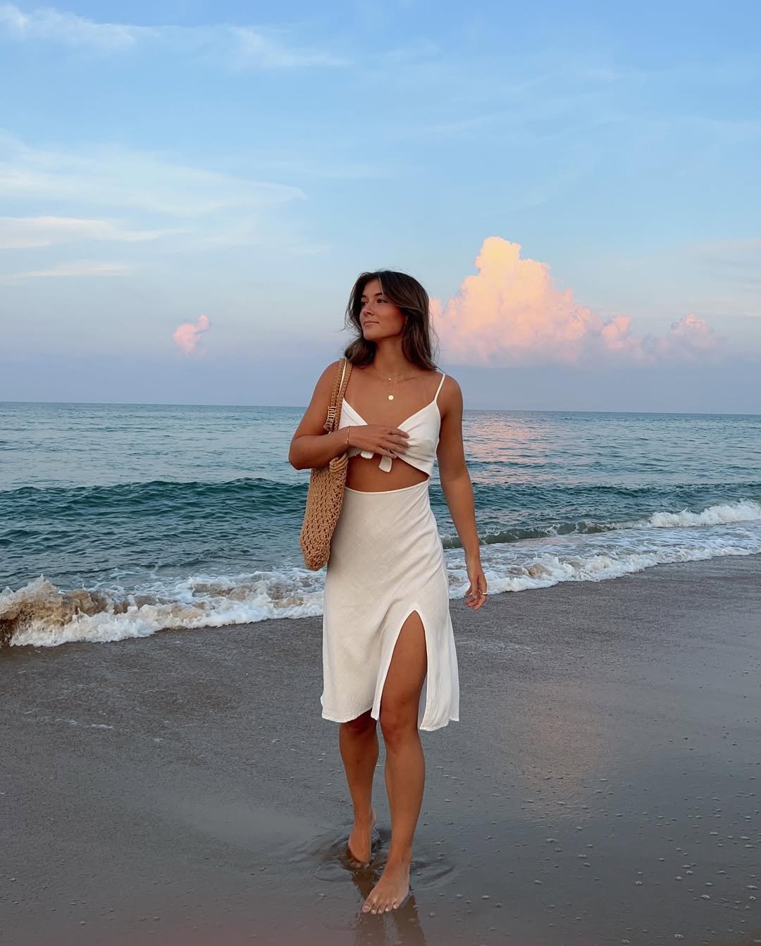 Soft white against the ocean just hits differently. A breezy skirt with a subtle slit and a simple cropped top creates that light, barely-there feel that moves with you as you walk along the shoreline. The woven bag adds texture without taking away from the calm palette.