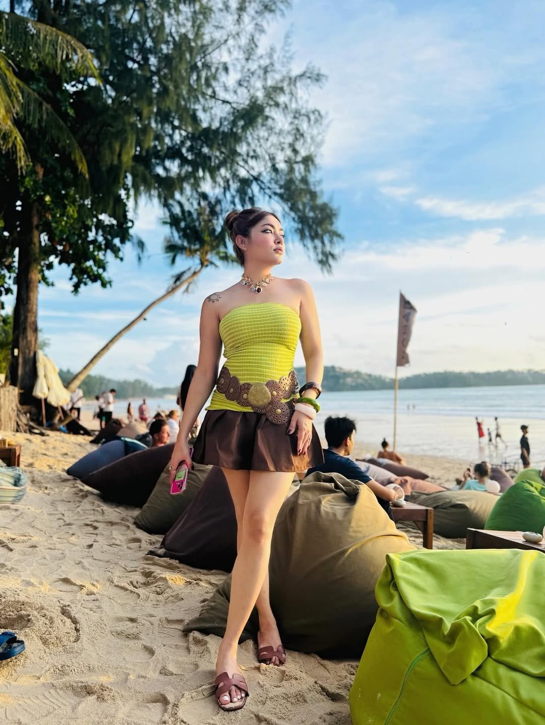 This look leans into color in the best way. A lime bandeau paired with a rich brown mini skirt creates a bold contrast that feels lively against sandy tones. The wide belt and layered accessories give it that slightly retro, beach-club energy.