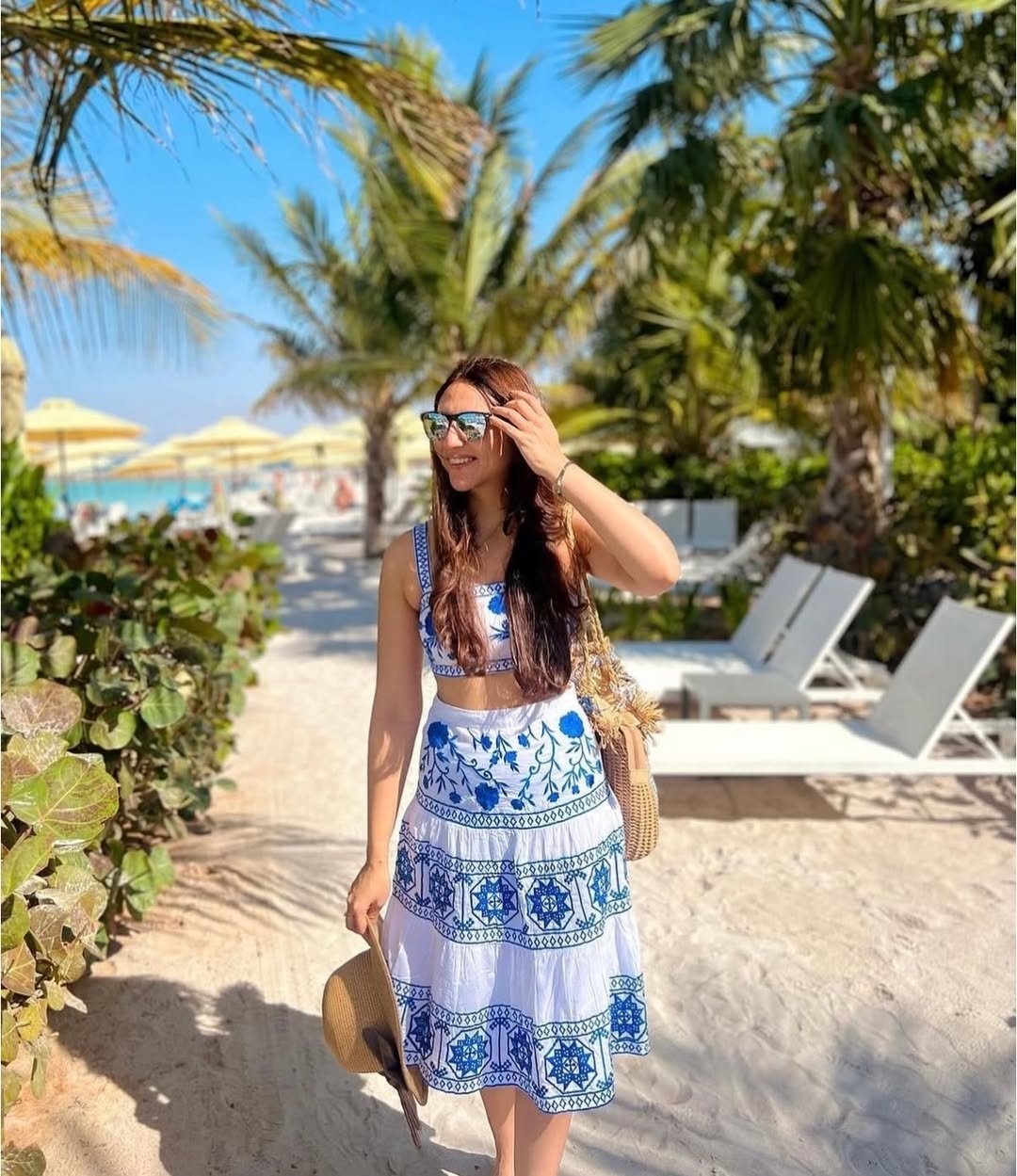 This matching set feels like it was pulled straight from a Mediterranean daydream. Crisp white fabric layered with intricate blue patterns brings that timeless coastal charm, while the cropped top keeps it fresh and current. Add oversized sunglasses and a woven bag, and suddenly it’s giving full resort energy.