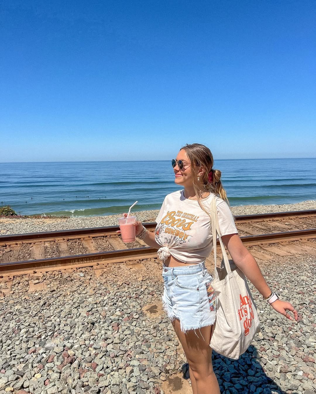 A knotted graphic tee and distressed denim shorts feel like pure summer nostalgia. Walking along the tracks with the ocean in view, it’s giving carefree energy with just enough personality. The tote bag adds a practical touch that still feels on theme.