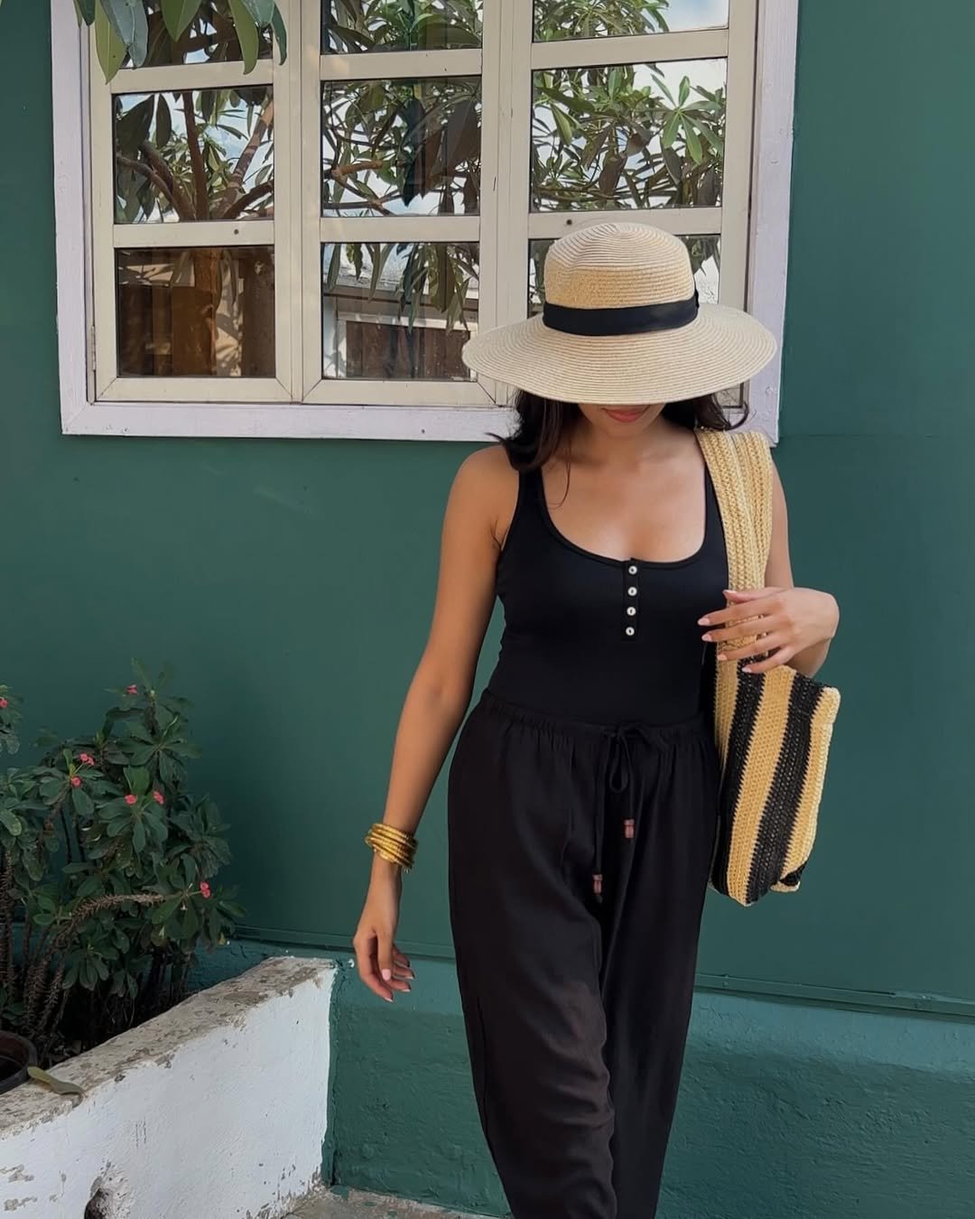 A black sleeveless top paired with relaxed trousers proves that coastal style doesn’t always need light tones. The straw hat and woven tote bring in that beach texture, balancing the darker palette beautifully.
