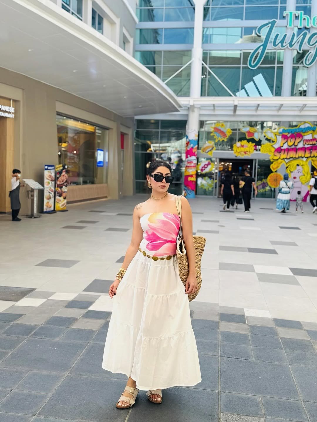 A strapless floral top paired with a flowing white skirt brings a playful contrast to an urban backdrop. The soft volume of the skirt balances the structured top, while gold accents add a hint of warmth. Even surrounded by glass and concrete, it still carries that beach-ready feel.