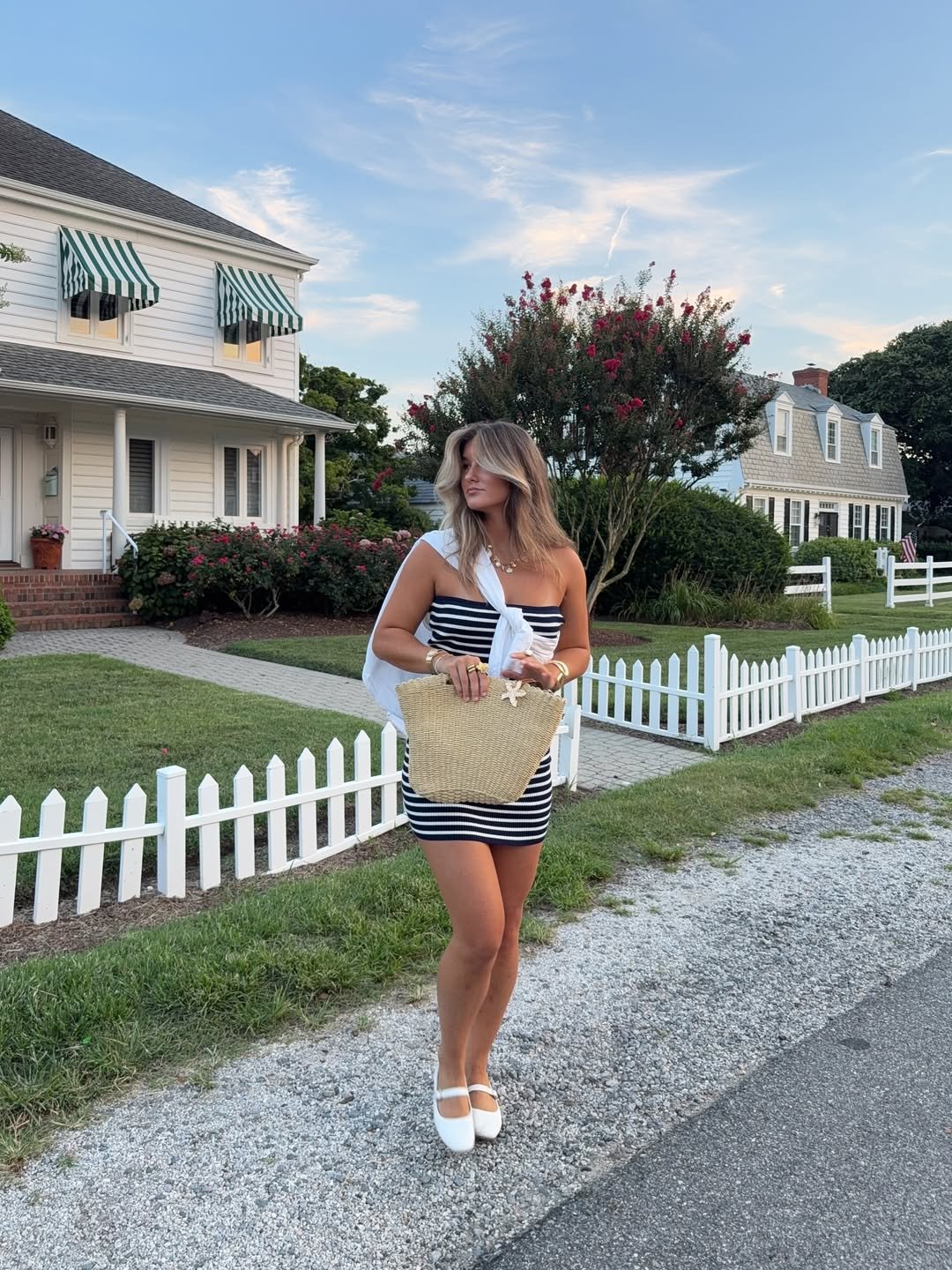 There’s something about crisp stripes by the coast that never misses. This fitted black and white mini paired with a soft white layer draped over the shoulders feels straight out of a seaside afternoon, where the air is warm but the breeze still lingers. The woven tote and delicate gold jewelry pull everything together with that effortless vacation polish.