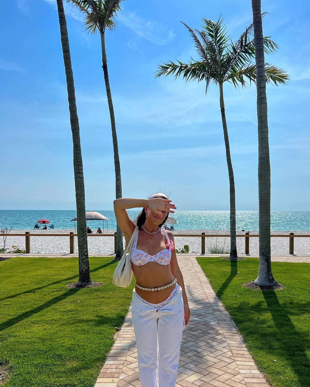 Sunlight, palm trees, and a floral bikini moment that feels playful but still pulled together. The low-rise pants layered over swimwear add just enough coverage while keeping that beach-day energy intact. A shell belt detail brings in a nostalgic touch that feels very now again.