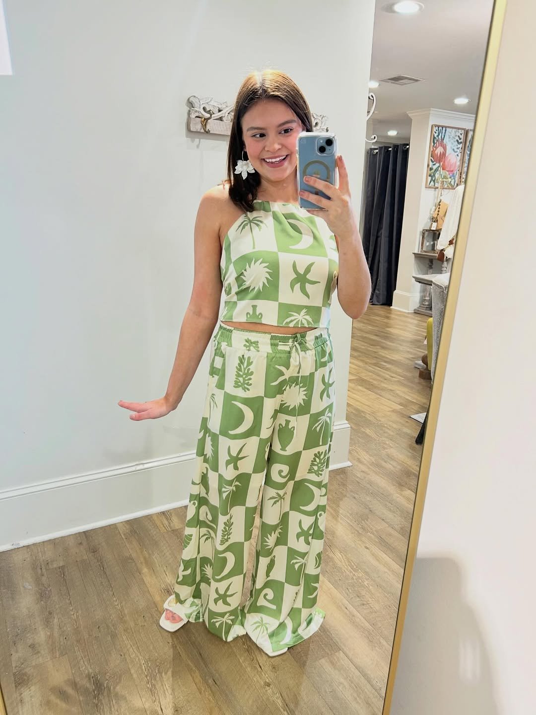 A matching set in soft green with whimsical prints brings a fresh, playful twist to coastal style. The wide-leg pants and cropped top create movement, while the pattern adds personality without overwhelming the look.