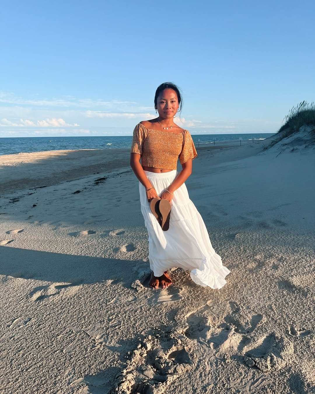 Warm earth tones and airy white layers come together in the most calming way. A smocked top paired with a flowing skirt creates movement that feels almost meditative, especially against the quiet stretch of sand. Barefoot with sandals in hand, it leans into simplicity.