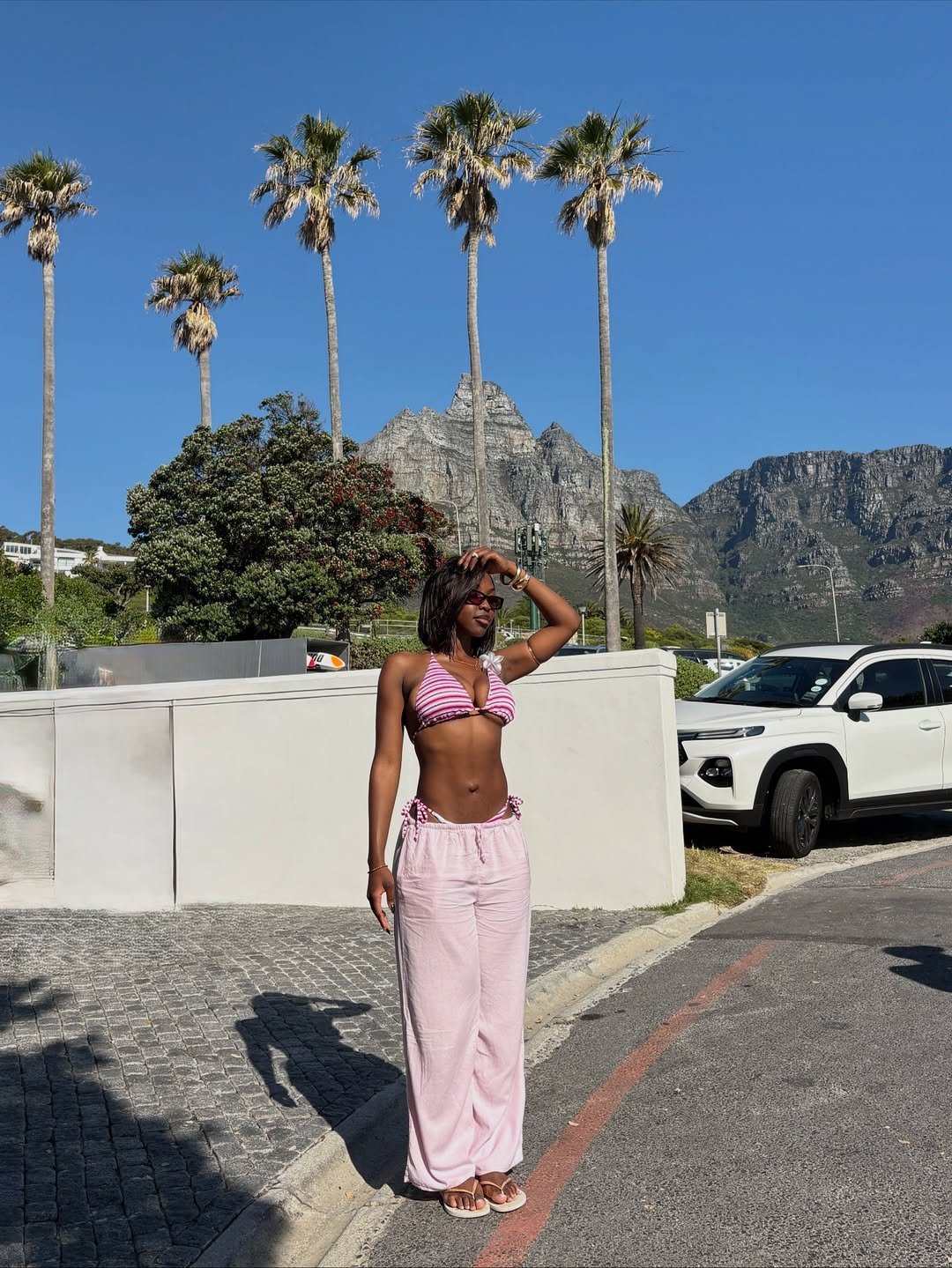 Muted pink tones against a bright coastal backdrop feel soft yet confident. A striped bikini top paired with loose, airy pants creates a balance that’s both relaxed and styled. The look leans into comfort while still feeling curated.