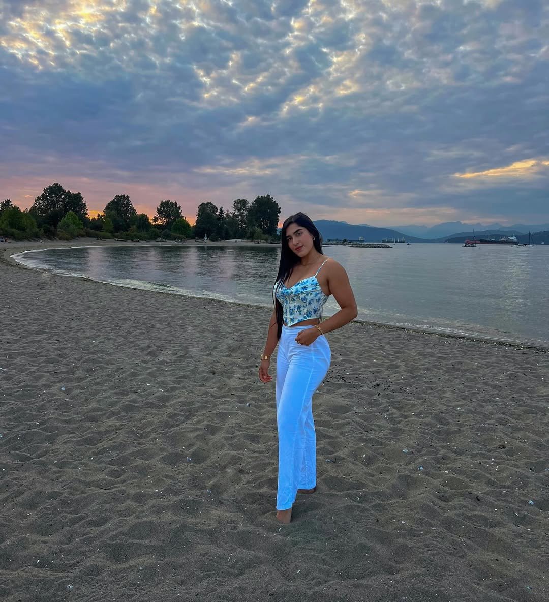 There’s a softness to this look that mirrors the sky just before dusk. A delicate printed top tucked into clean white trousers feels relaxed, but still intentional. The muted palette works beautifully against the calm shoreline and distant mountains.