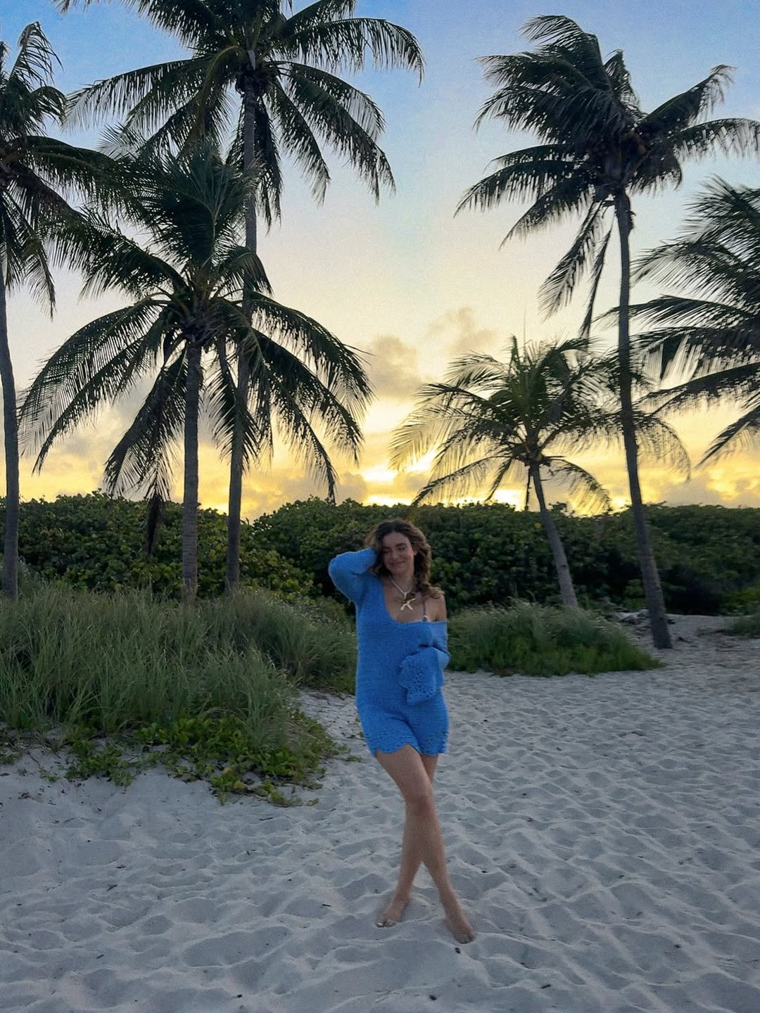 That soft blue knit against a golden sunset feels almost cinematic. The off-shoulder silhouette adds a relaxed, slightly undone feel, while the texture keeps it cozy as the evening cools down. Paired with bare feet in the sand, it’s effortlessly intimate.