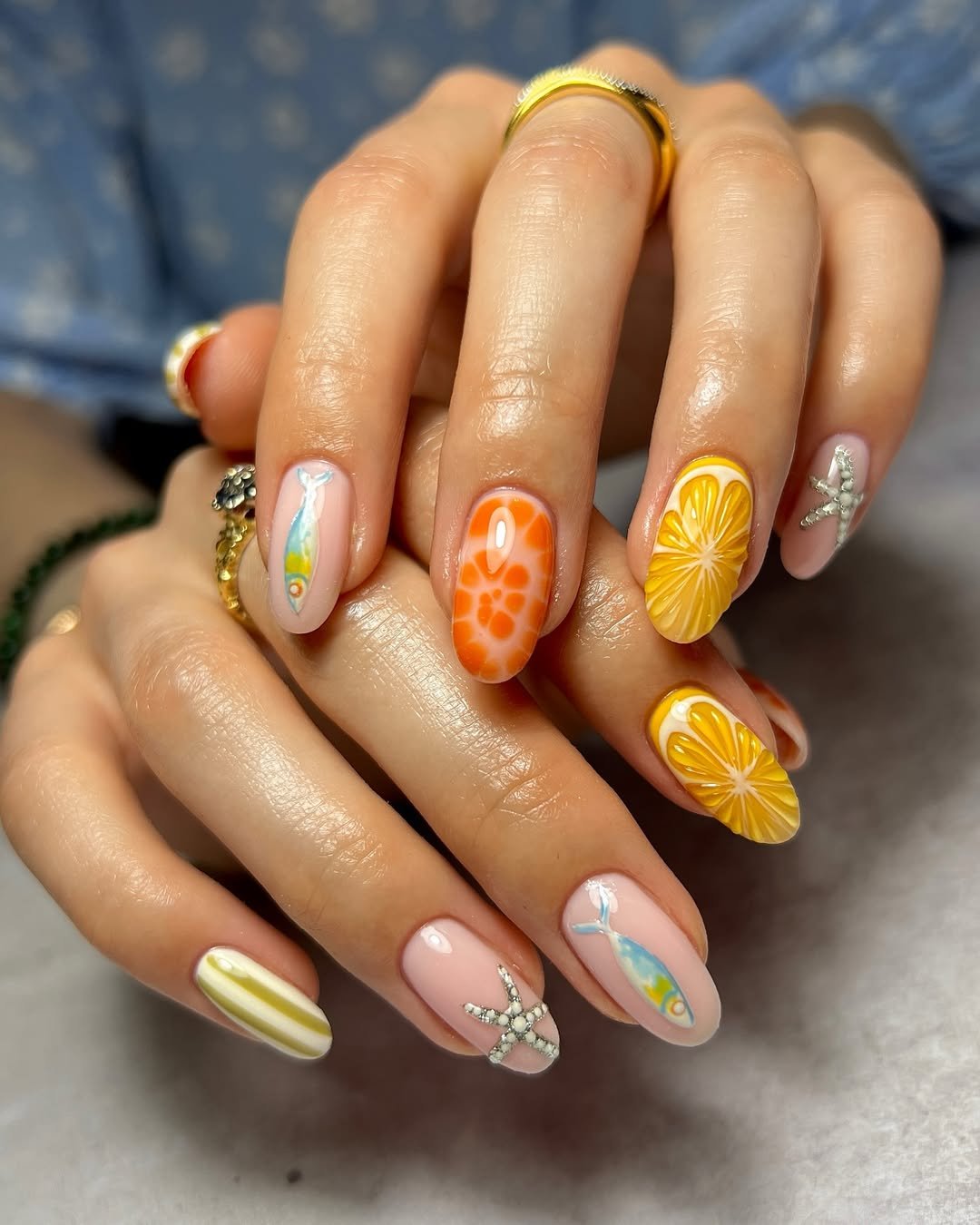 These nails lean into a fun coastal theme with bright citrus slices, little fish details, and soft ocean-inspired tones. The mix of texture and color gives each nail its own mini artwork.