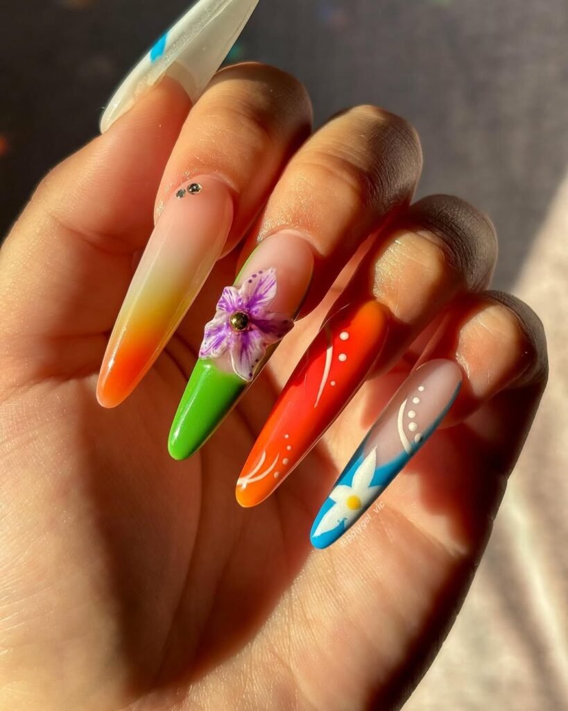 This manicure is pure color confidence. Bright orange, green, and blue shades come together with playful line work and bold florals, creating a set that feels vibrant and artistic all at once.