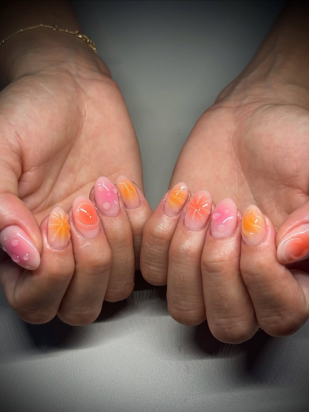 These nails bring soft summer tones with a glossy, almost jelly-like finish. Warm orange and peach shades blend gently across the nails, creating a glowing effect that feels fresh and bright.