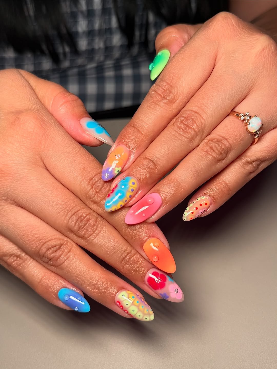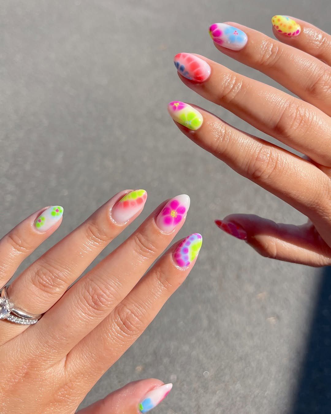 These nails are pure summer energy. Neon pinks, greens, and blues blend together in soft gradient patterns, creating little bursts of color that look like abstract flowers.