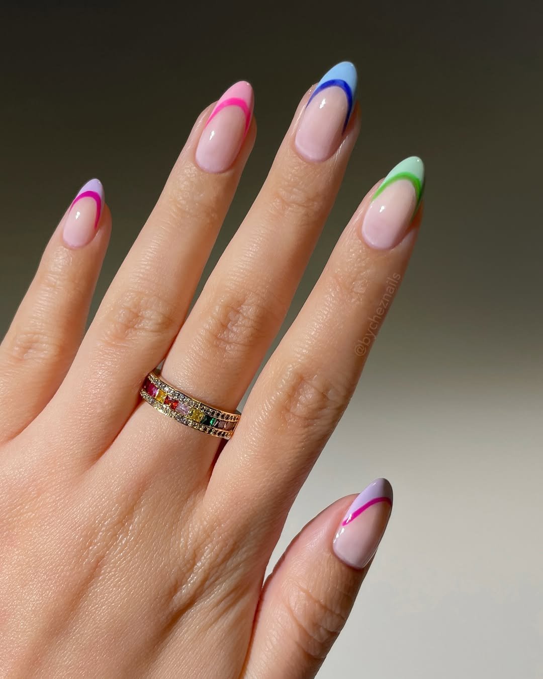 Sometimes the smallest details make the biggest impact. This soft nude base with curved colorful lines keeps things light, airy, and modern. Each nail features a different pop of color, which keeps the set feeling playful without being too busy.