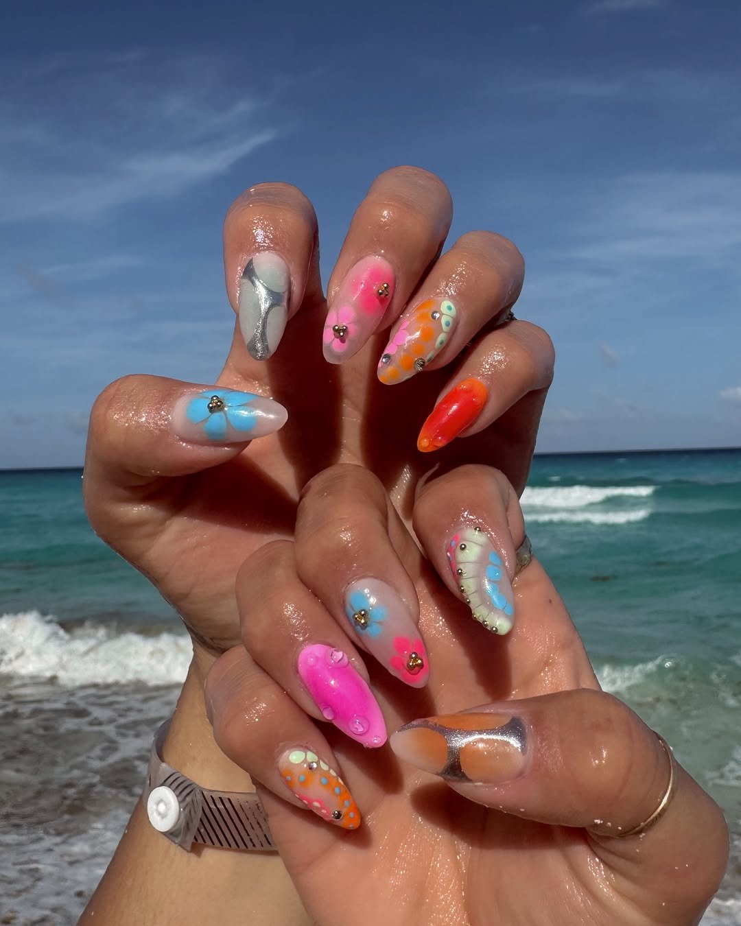 Each nail brings its own design moment, but the color palette keeps everything cohesive. It’s the kind of manicure that instantly grabs attention and makes your hands feel like tiny works of summer art.