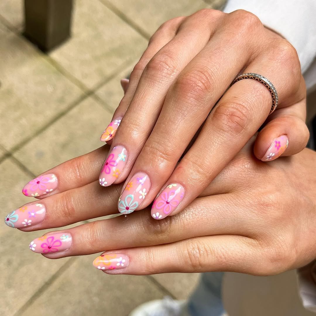 This manicure goes all in on color and personality. Bright shades of blue, coral, yellow, and pink mix with cute details like dots, tiny flowers, and playful patterns that keep every nail interesting.