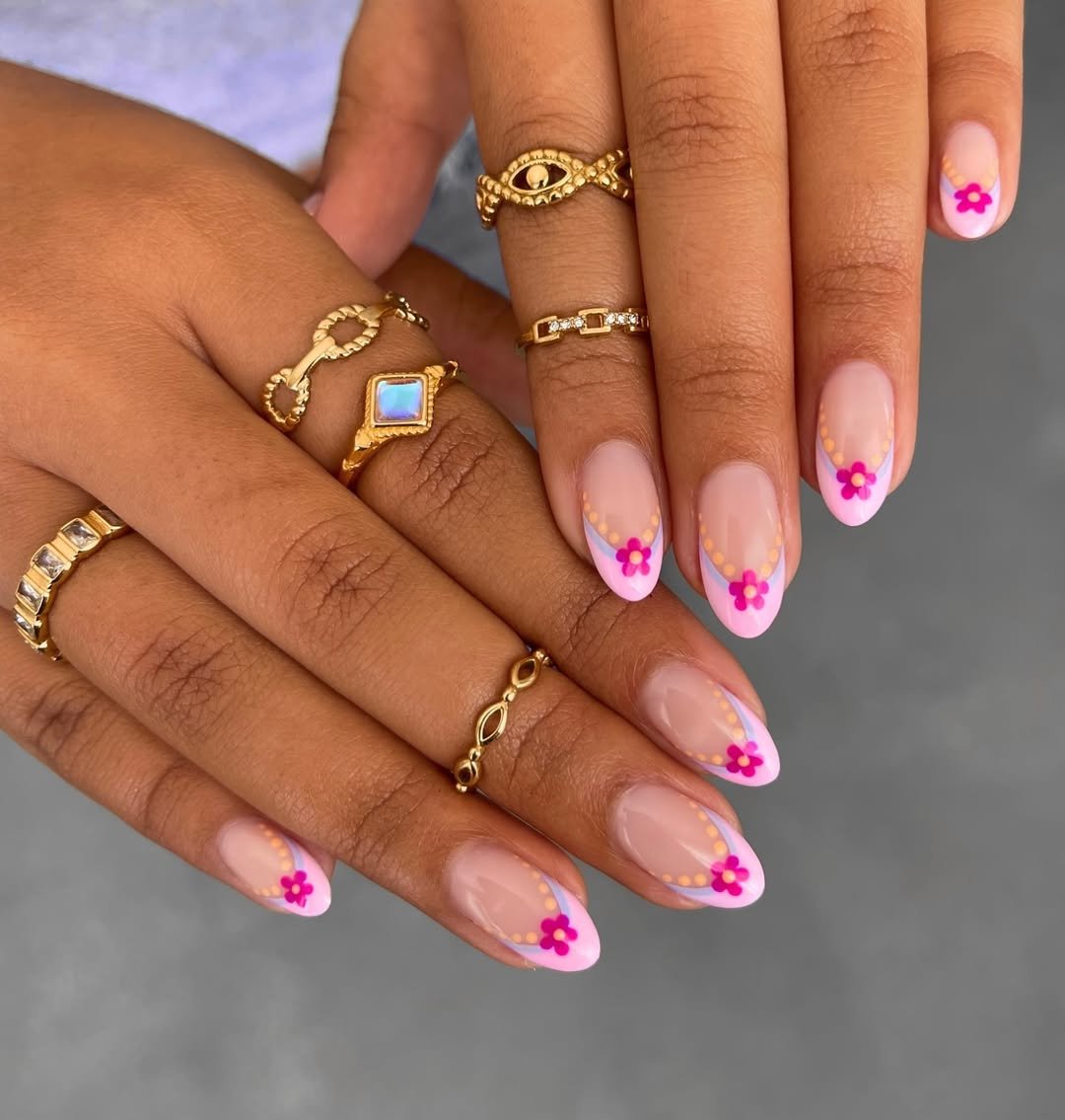 This set is the perfect example of how a tiny detail can completely elevate a simple manicure. The soft pink French tips paired with those little daisy accents feel playful, fresh, and very “sunny-day energy.” It’s delicate but still colorful enough to stand out.
