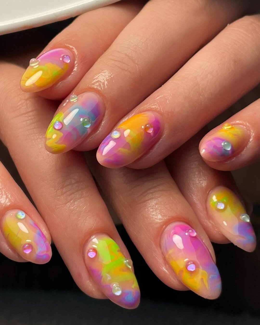 These nails feel like summer bottled into color. The soft translucent base mixed with swirls of neon yellow, pink, green, and purple creates that dreamy watercolor effect that’s impossible to stop staring at.