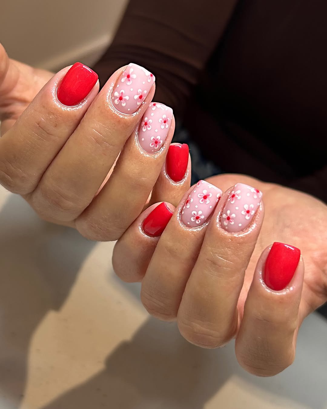 There’s something timeless about red nails, and this set proves exactly why. The glossy red paired with soft nude nails covered in tiny floral details creates a design that feels both elegant and cheerful.