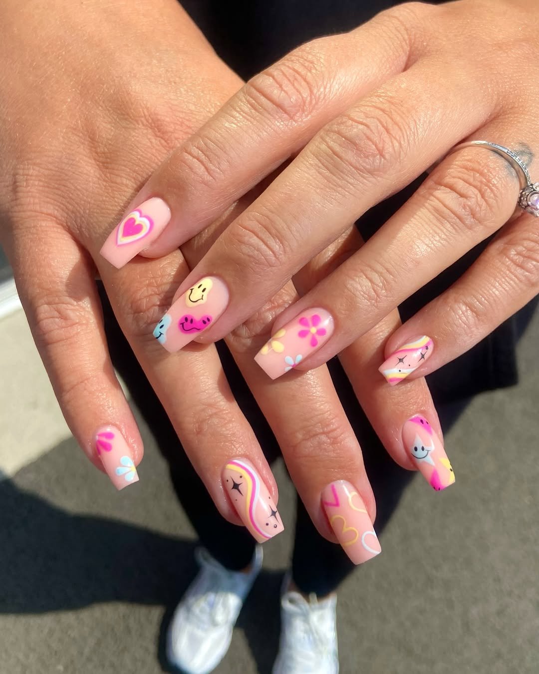 This set feels like a throwback to playful Y2K nail art—but in the best way possible. Smiley faces, pastel hearts, and cute little flowers create a design that’s fun, colorful, and full of personality.