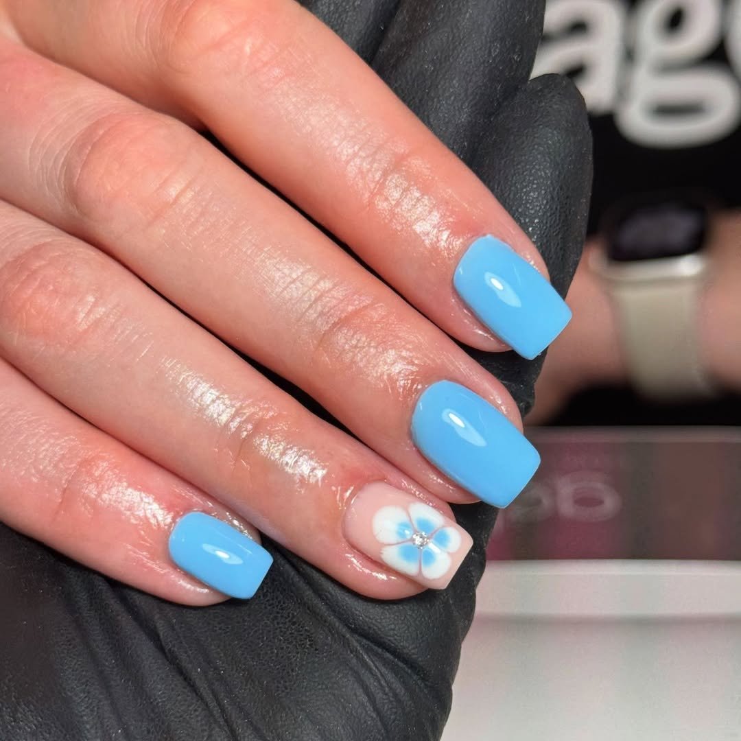 If calm summer mornings were a manicure, they’d probably look like this. The soft baby blue polish paired with that delicate floral accent nail creates a design that feels clean, fresh, and quietly pretty.