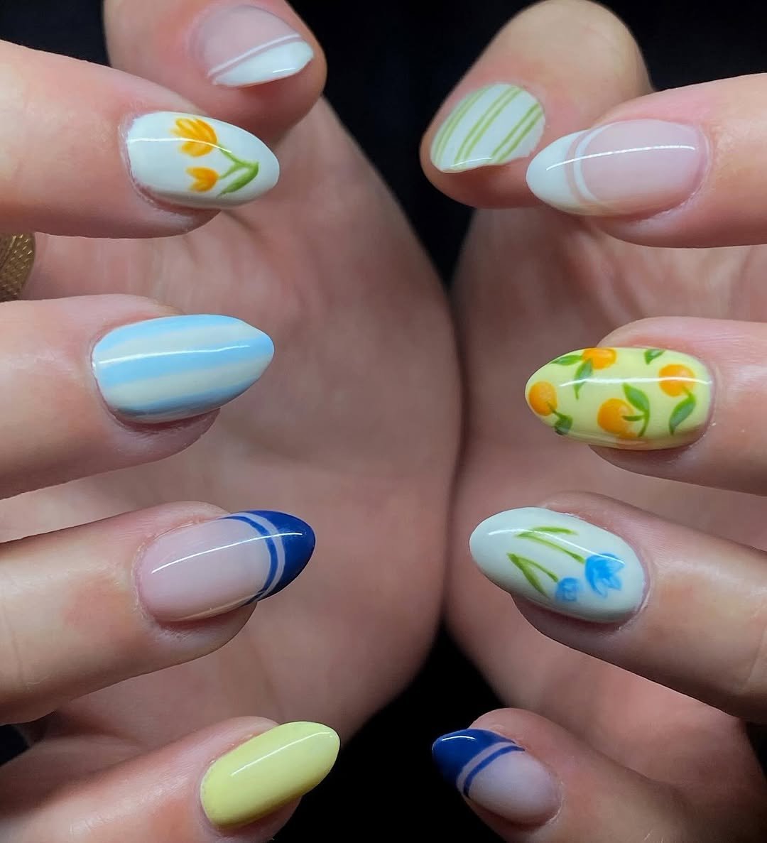 What makes it work is the variety. Each nail brings something different—little oranges, flowers, and soft stripes—yet the color palette keeps everything looking beautifully balanced.