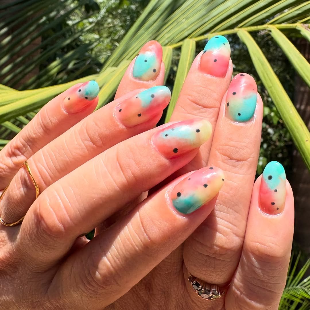 The slightly blended colors make the design feel fresh and modern instead of cartoonish. It’s playful, colorful, and exactly the kind of manicure that belongs at a pool party.