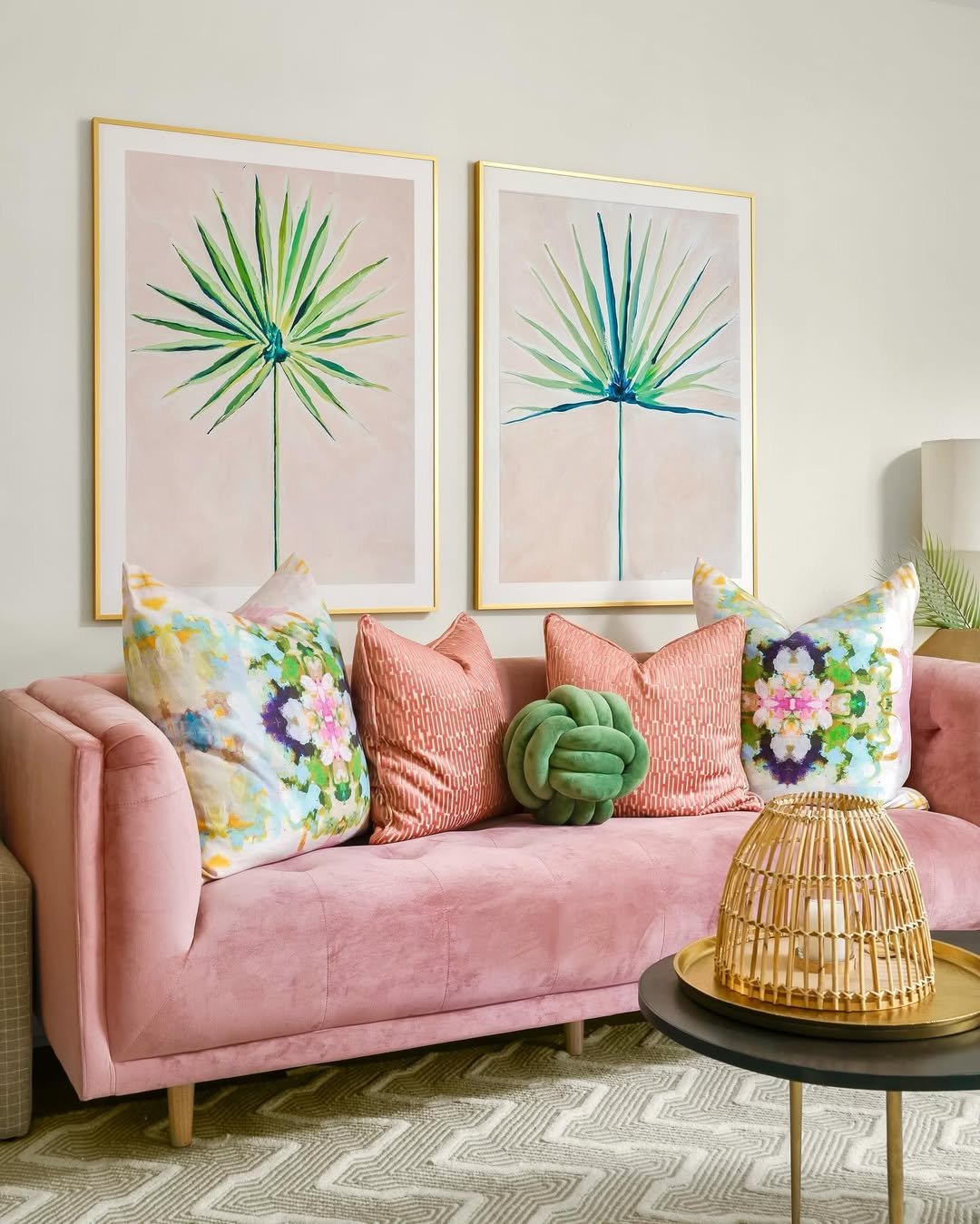 That blush sofa sets the tone, but the pillows bring the personality. Abstract florals, subtle patterns, and that sculptural green knot pillow—everything feels intentional without being overthought.