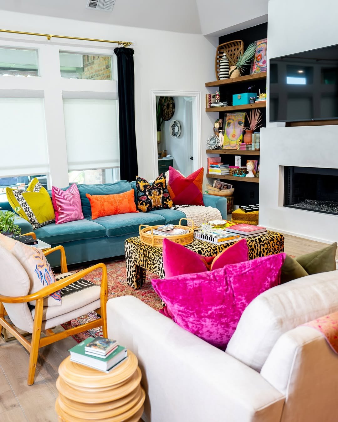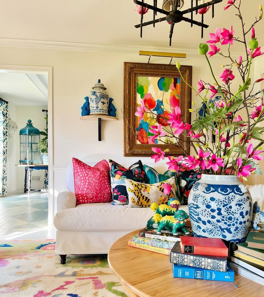 This space feels like a curated mix of stories. Bright florals, patterned pillows, and bold colors layered together in a way that feels collected, not chaotic. Even the surrounding decor leans into that vibrant, artistic vibe.