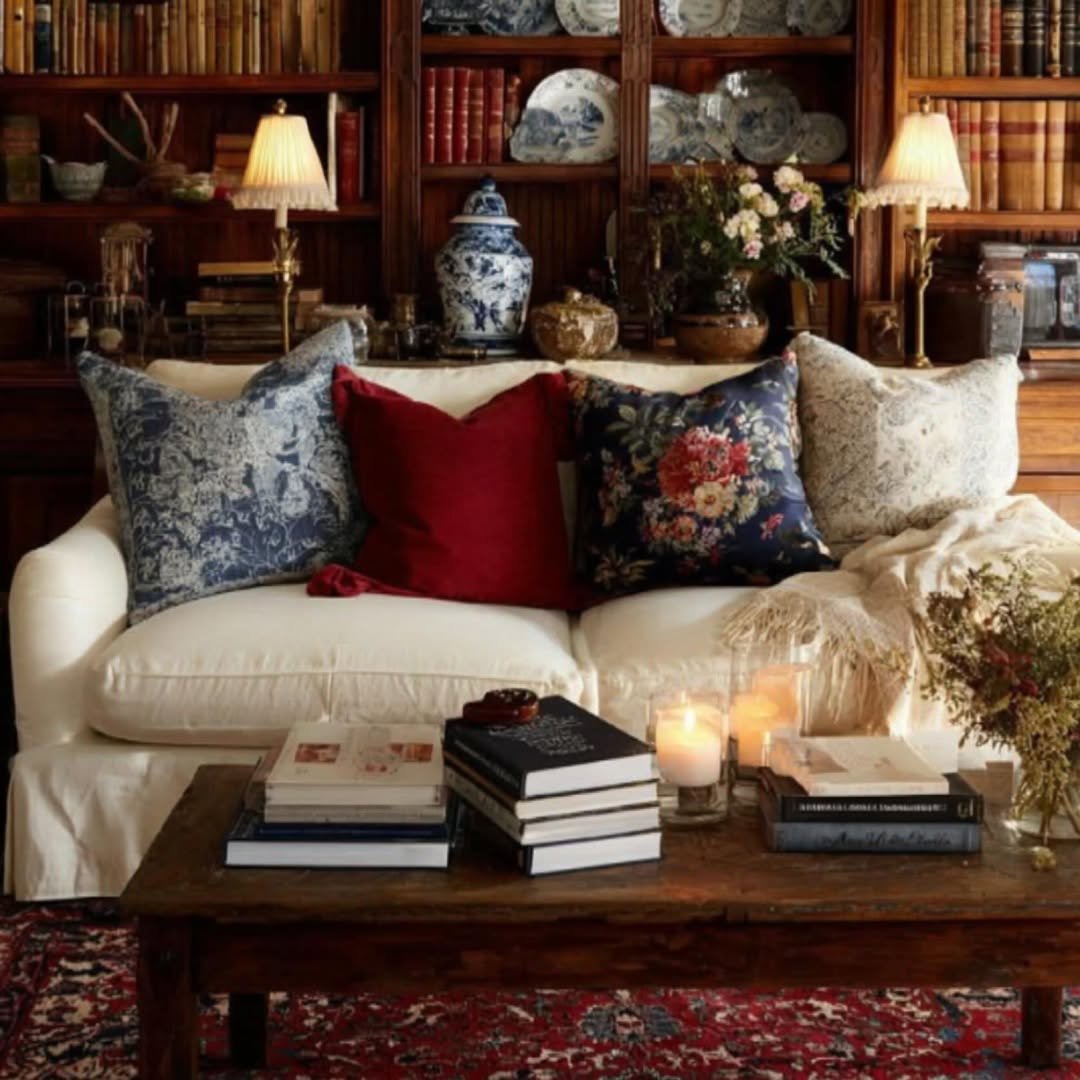 This setup is pure timeless charm. Rich wood tones, layered textiles, and those deep-toned pillows—especially that red—bring a sense of warmth that feels almost nostalgic. It’s giving “library you never want to leave.”