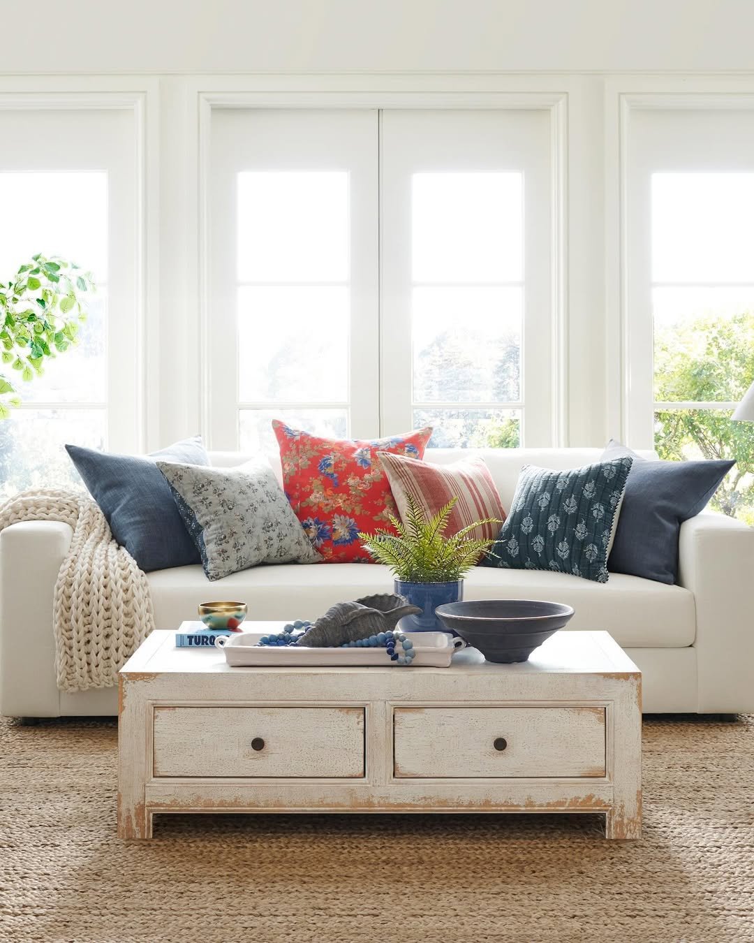Here’s proof that colorful pillows don’t need a loud room to shine. Against that crisp white sofa, the mix of blues, reds, and soft patterns feels fresh and elevated, not overwhelming.