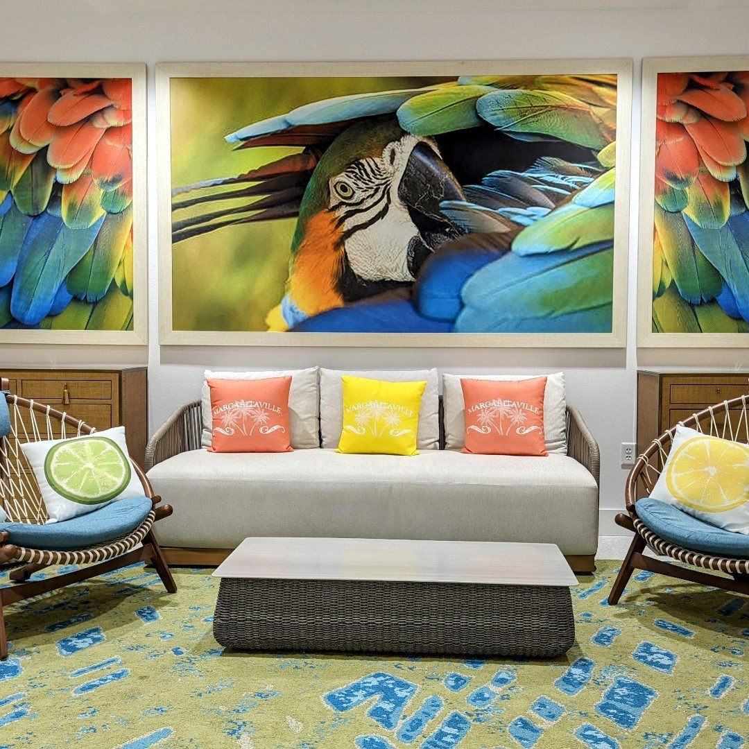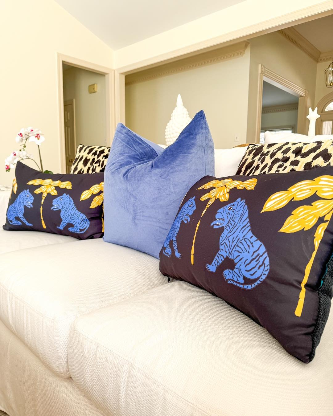 That oversized parrot artwork already steals the show—but the pillows hold their own. Pops of yellow and coral play off the artwork beautifully, while the neutral base keeps things from going overboard.