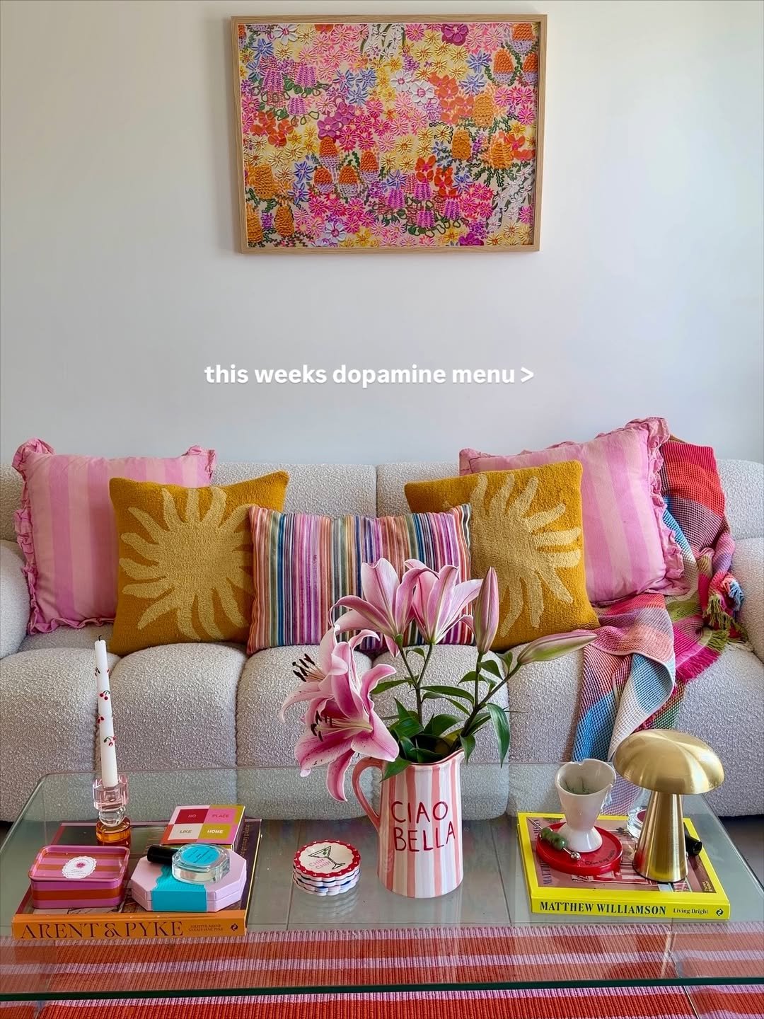 This one is pure serotonin in a living room. The mix of sunny yellows, candy pinks, and that playful striped pillow feels like a mood boost you can actually sit on. Even the little details—the “ciao bella” vase, glossy trays—carry that same cheerful energy.