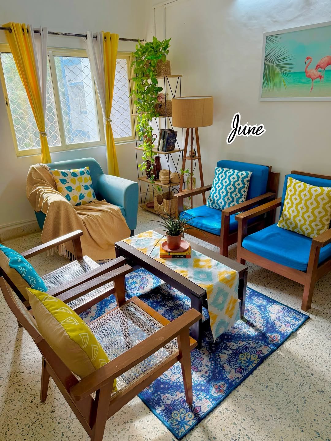 There’s something instantly refreshing about this setup. Lime and lemon pillows paired with those bright coral tones give it a vacation-ready vibe, while the neutral sofa keeps it grounded.