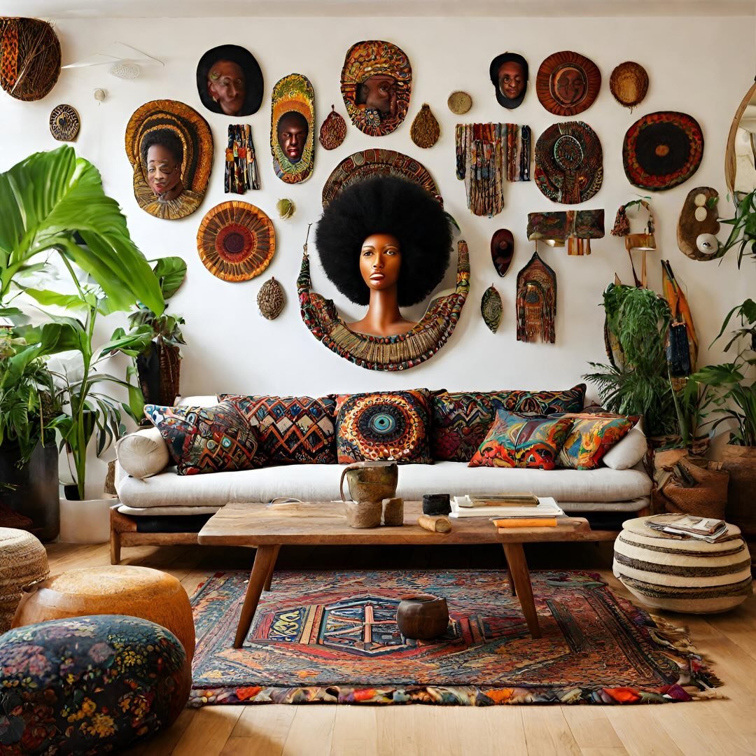 This one hits differently—it’s not just color, it’s culture, texture, and storytelling all wrapped into one. The pillows carry rich patterns and earthy tones that echo the art wall behind, making everything feel deeply connected.