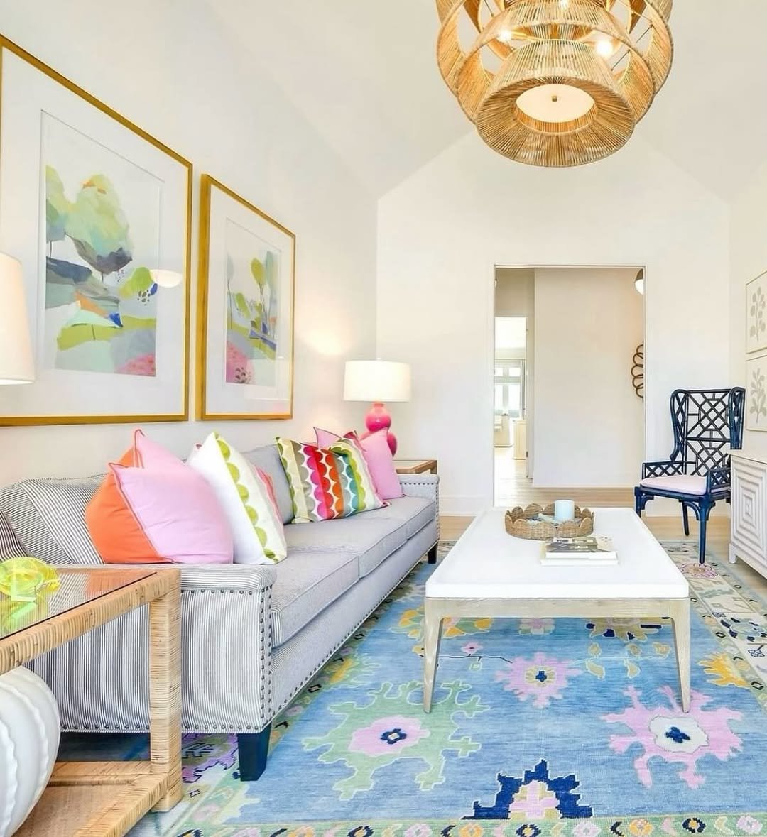 Soft doesn’t have to mean boring—and this room proves it. Those pastel pillows lined up on the sofa feel like a perfectly curated color palette, echoing the rug and artwork without being too matchy.