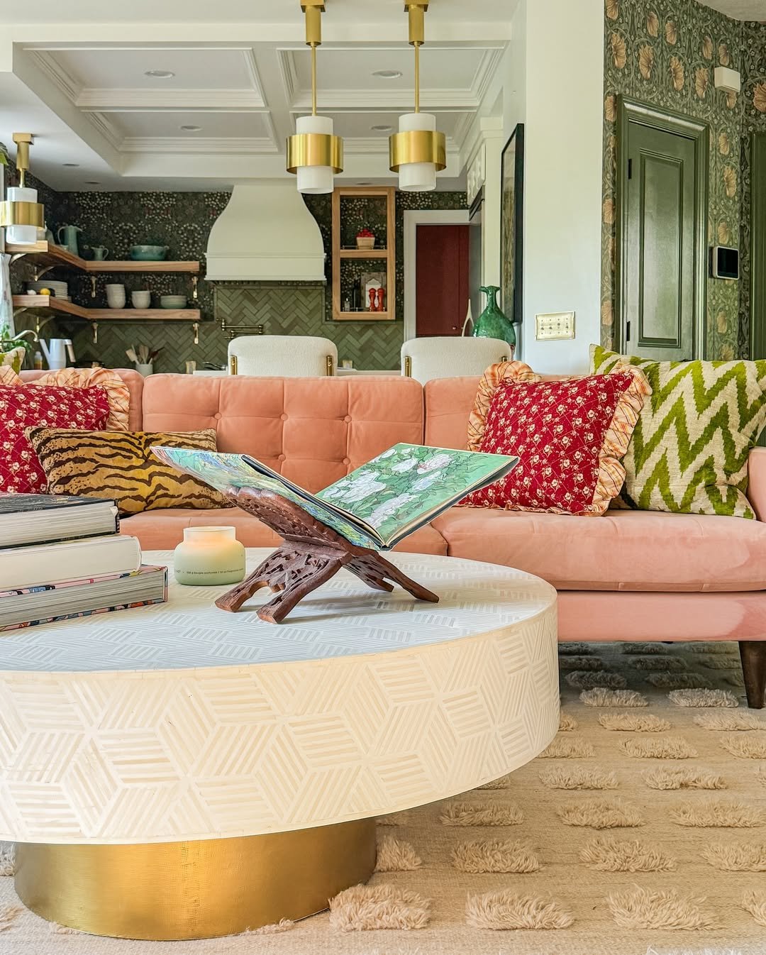 There’s a beautiful chaos here—in the best way. Florals, zigzags, textures, all layered over that soft blush sofa. And instead of clashing, they somehow create harmony through color repetition and tone.