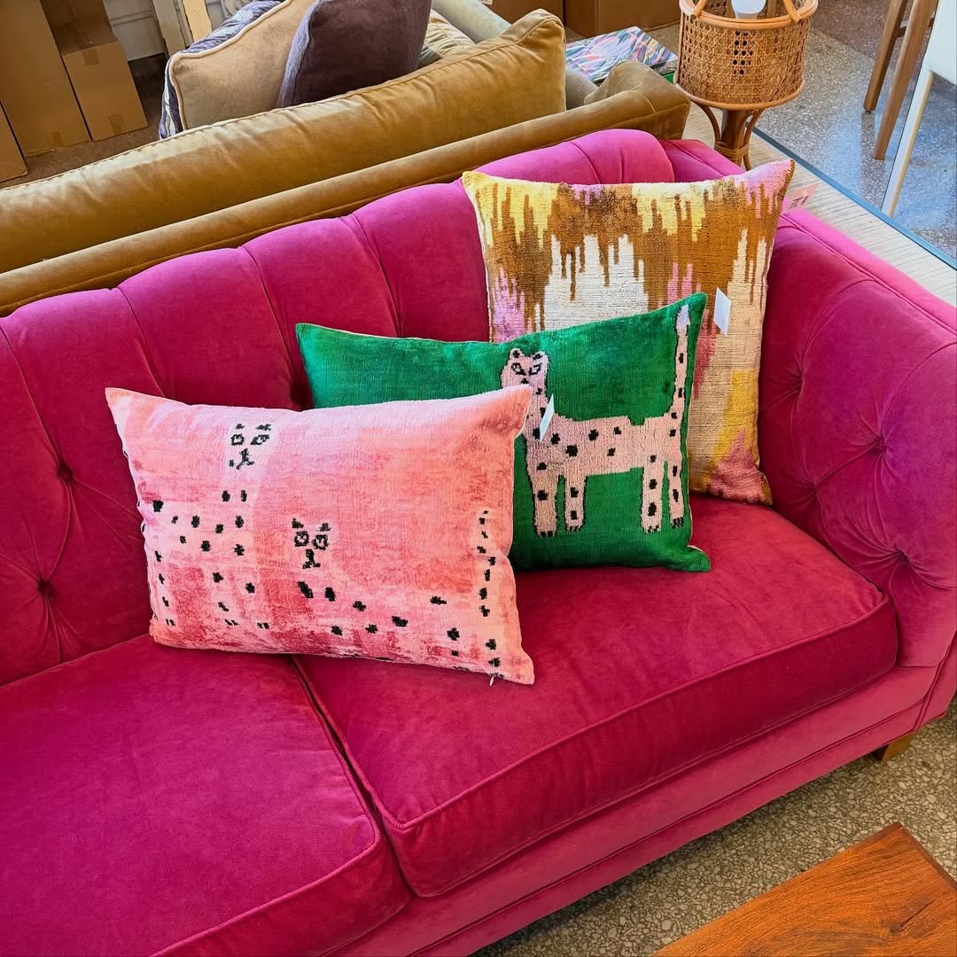 That bold pink sofa is already making a statement—but the quirky pillows take it even further. Graphic prints, unexpected color combos, and a slightly offbeat charm that makes the whole setup feel fun and fearless.