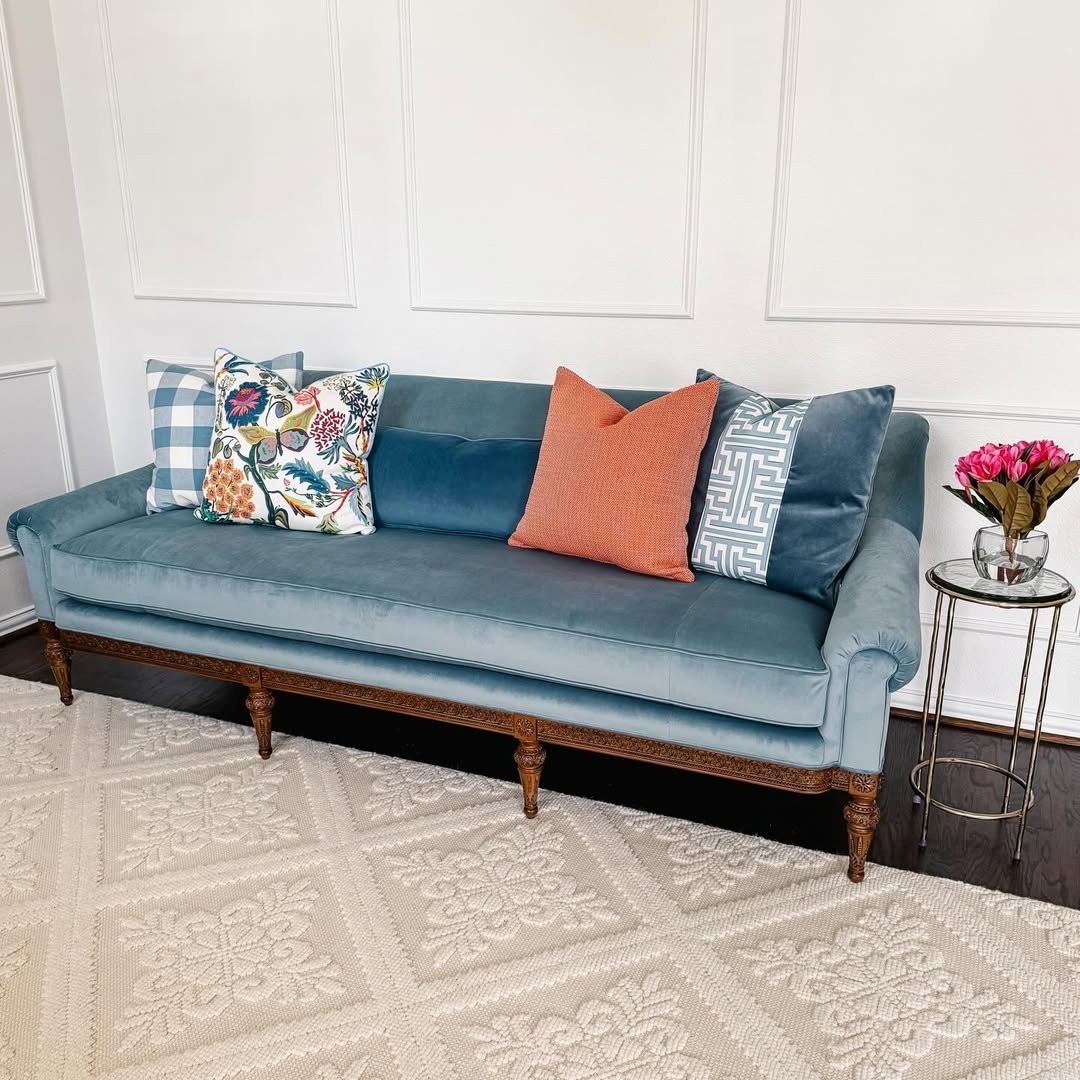That muted blue sofa is doing a lot of heavy lifting—and doing it well. The pillows bring in just enough contrast: a bit of pattern, a touch of coral, a hint of structure. Nothing loud, but definitely not forgettable.