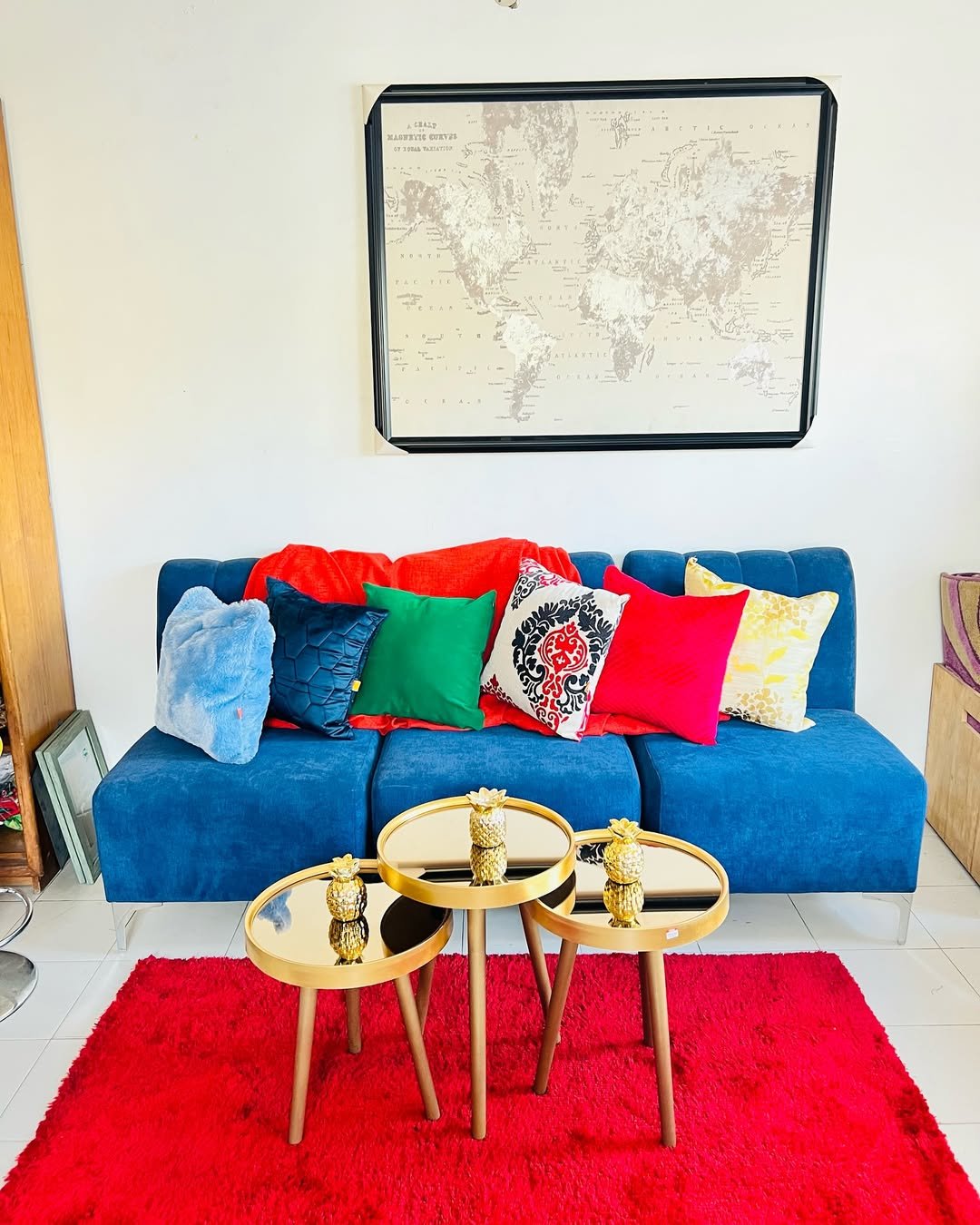 This setup is all about bold contrasts. A deep blue sofa, bright red throw, and a mix of pillows that don’t hold back—greens, pinks, patterns. It’s vibrant, high-energy, and instantly eye-catching.