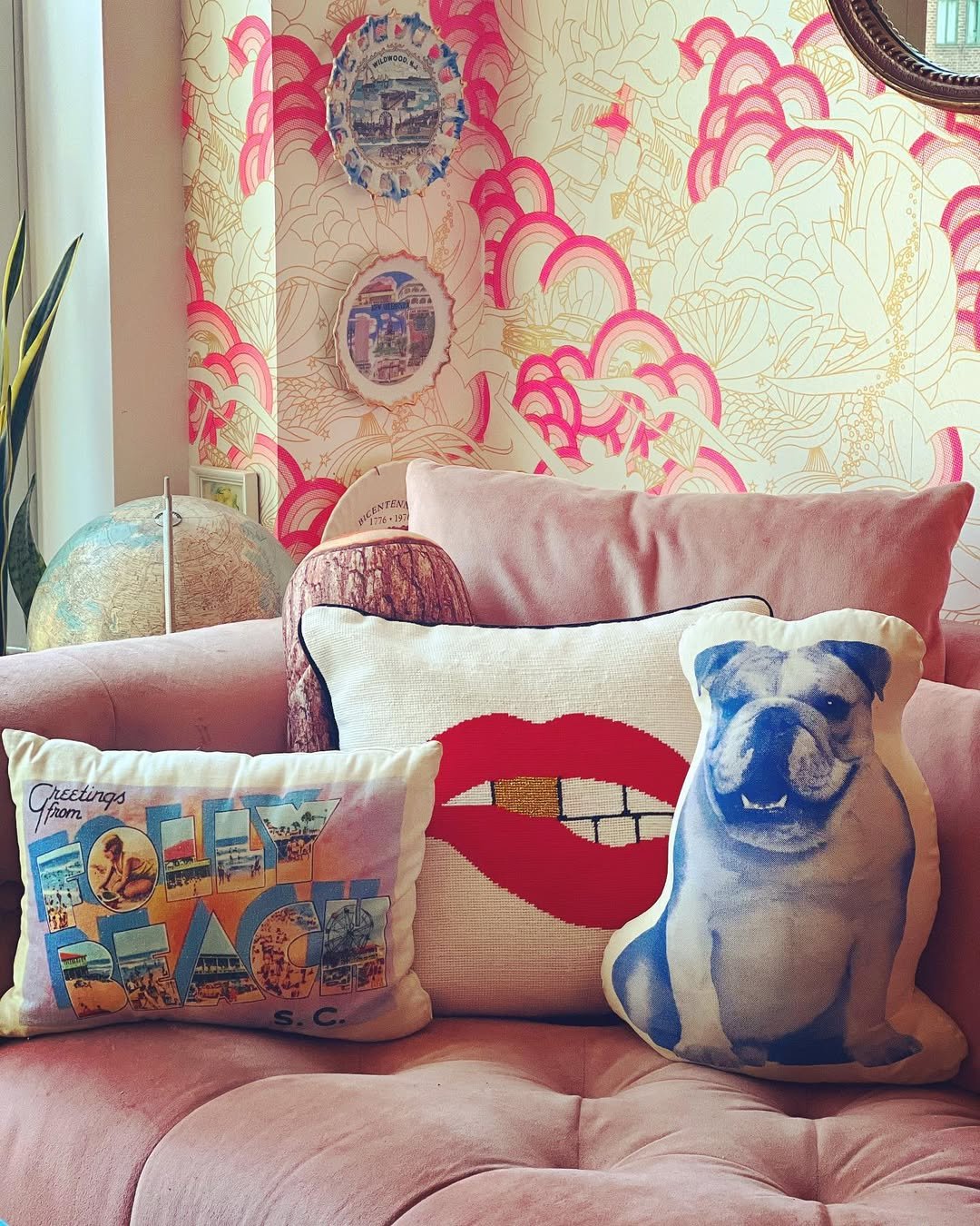 This is where personality takes center stage. From the playful lip pillow to the illustrated dog and vintage postcard vibe—every cushion tells its own little story. The soft pink sofa keeps it cohesive while letting the prints shine.