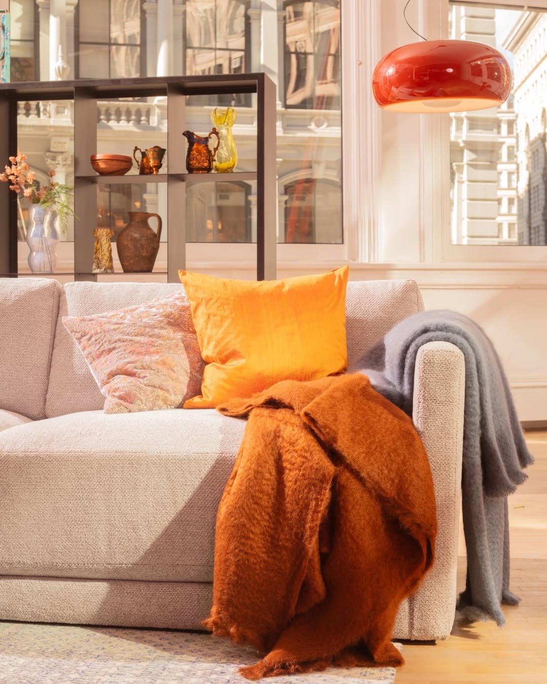This space leans into warmth in the most effortless way. That soft neutral sofa becomes the perfect canvas for bold orange pillows and that casually draped throw—like sunlight decided to stay a little longer. The glass pendant above quietly echoes the palette, tying everything together without trying too hard.