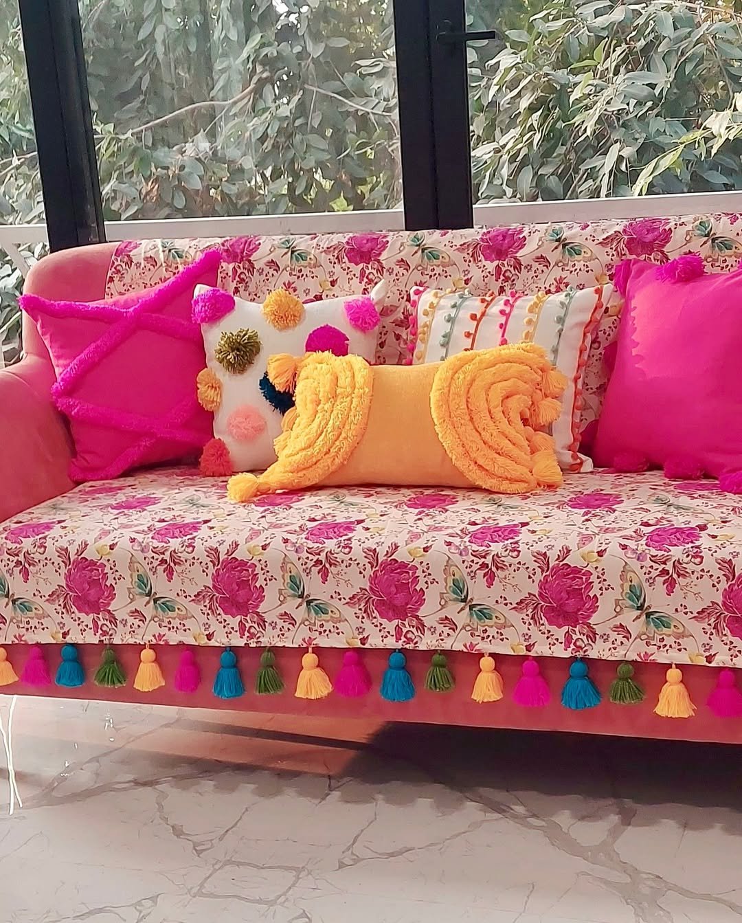 This sofa is basically a celebration. Between the bold pinks, sunny yellows, and those playful pom-pom details, it feels like every pillow showed up ready to party. Even the floral upholstery underneath joins in, creating layers of color that somehow don’t overwhelm—they just keep things exciting.