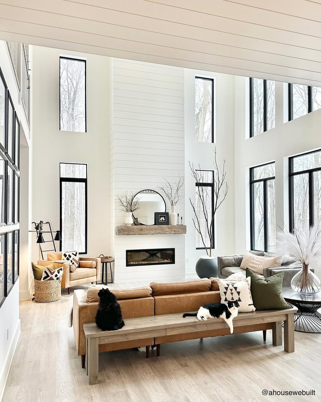 And those little details? The cats on the bench, the textured pillows, the fireplace glow—it all makes the space feel lived-in, not staged. Big, bright, and still somehow incredibly snug.