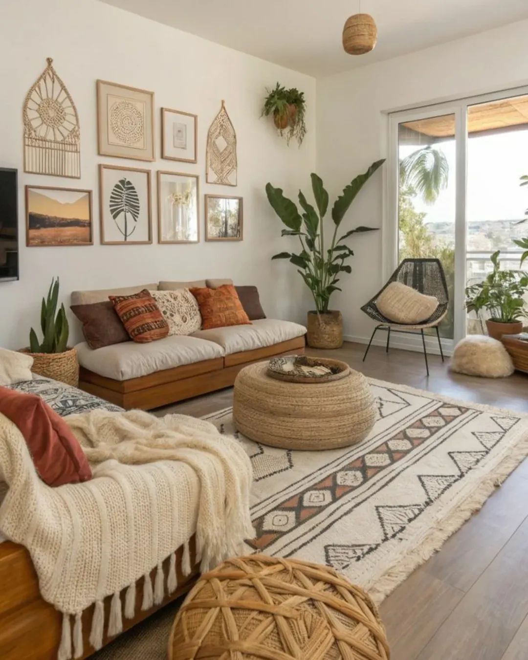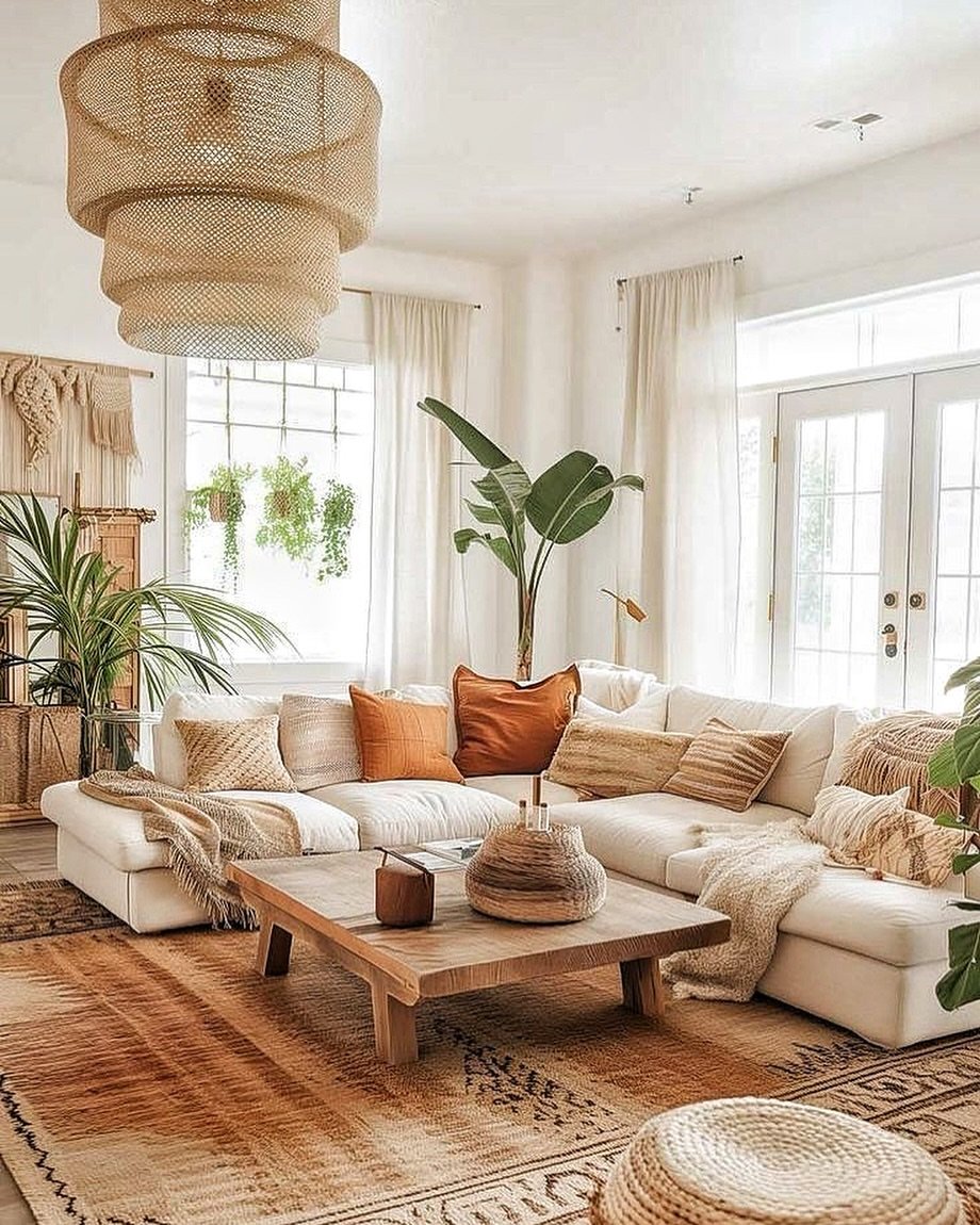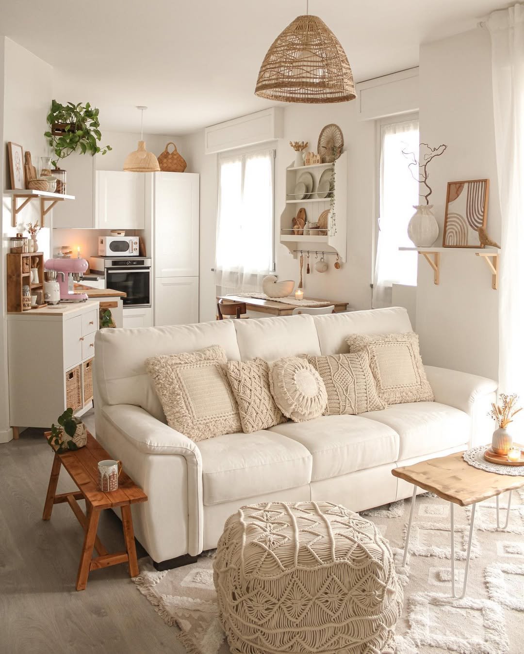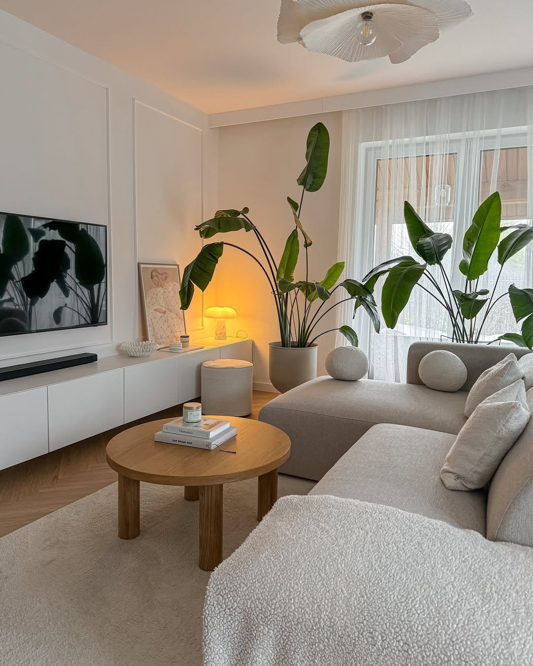 This room is basically sunshine in interior form. The mix of soft whites, earthy tones, and greenery makes everything feel fresh but still grounded.